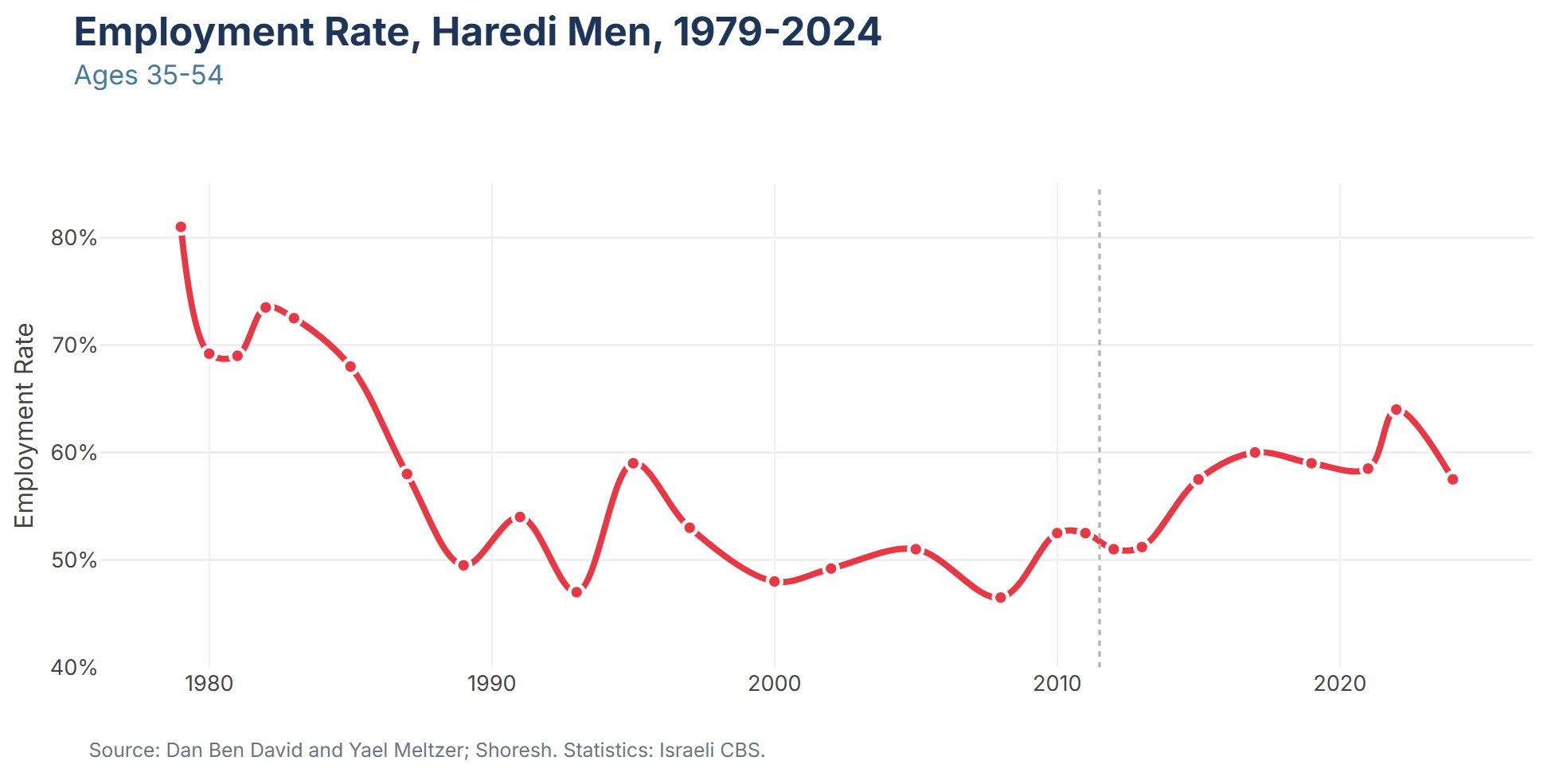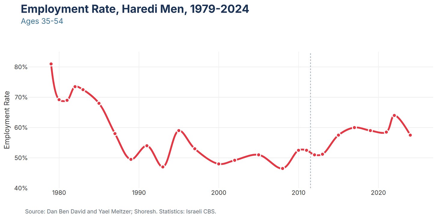As the benefits system took hold, Haredi male employment declined sharply. Just take a look at this amazing graph, by Prof. Dan Ben David of Tel Aviv University, from Shoresh Institution for Socioeconomic Research: