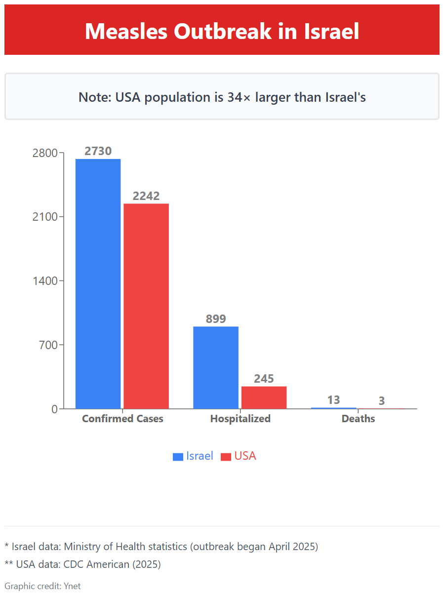 In the European Union, a total of 10 people died from measles between December 1st, 2024 and November 30, 2025. The EU’s population is 450 million, 45 times that of the State of Israel. The EU has regions, especially in Eastern and Central Europe, with completely failed, backward healthcare systems. Israel’s healthcare system is better than that of many countries in Europe. The lethality and extent of the Israeli outbreak are exceptional in the West.