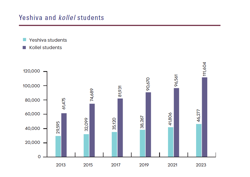 Since the economic reforms of 2003, there has been some turnaround, with a notable dip during the Great Financial Crisis of 2008. But that welfare system never went away. Instead, state support for Haredi post-secondary education institutions has increased, driving a 71% rise in yeshiva and kollel students from 2013 to 2023.