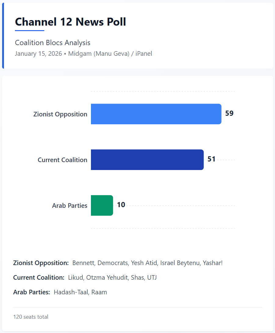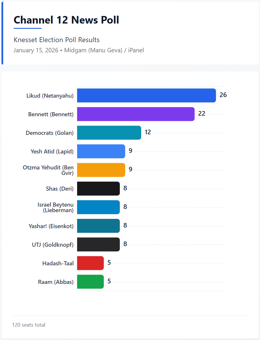 Here’s the most important coalition math: any partnership between Jewish and Arab parties threatens Netanyahu’s position. In almost all polls in the last 2 years (including four polls in just the last 3 days from Maariv, Channel 12, Israel Hayom, and Zman Israel), the current government loses to the opposition by roughly 69 to 51 out of the Knesset’s 120 seats.