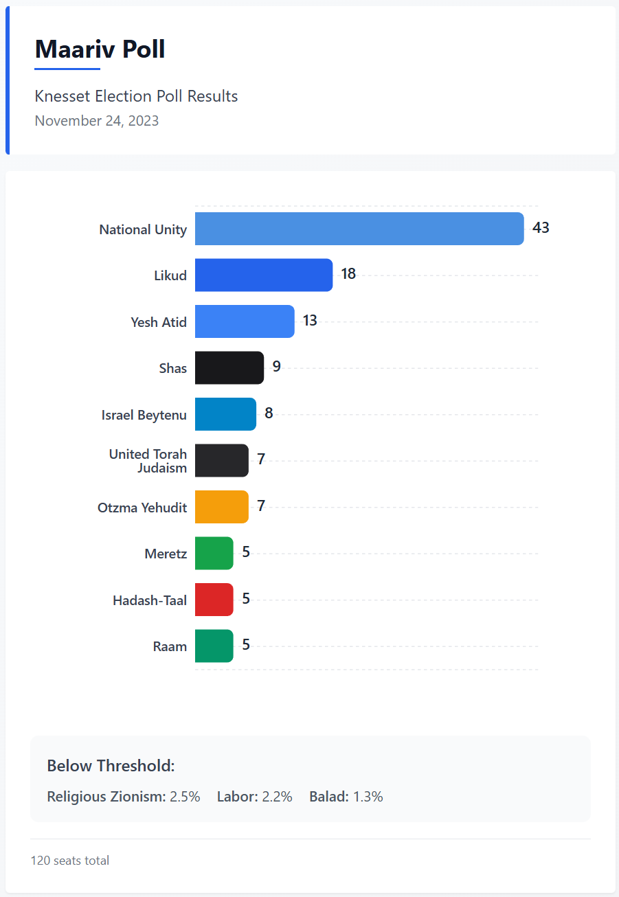 It was a stunning ascent for a party that holds only 12 Knesset seats. But with his security-focused messaging, his extensive defense credentials (Gantz led the IDF from 2011 to 2015), his willingness to join a Netanyahu-led government (allegedly putting country over political differences), and above all the catastrophic failure of Hamas’s invasion and the mass murder of Israelis — Gantz was catapulted to the head of Israeli politics. His victory in the polls only ended nine months later, in August 2024, when Netanyahu and the Likud finally clawed back his lead 22-20. Even then, Gantz would still have led the second-largest party.